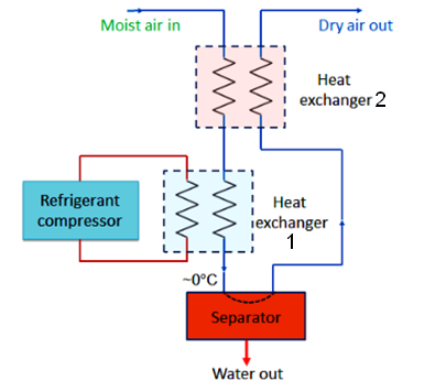 It consists of two heat exchangers, refrigerant compressor and a separator. The system circuitry is shown in Figure 6.3.3. The dryer chills the air just above 0°C which condenses the water vapor. The condensate is collected by the separator. However such low temperature air may not be needed at the application. Therefore this chilled air is used to cool the high temperature air coming out from the compressor at heat exchanger 2. The moderate temperature dry air coming out from the heat exchanger 2 is then used for actual application; whilst the reduced temperature air from compressor will further be cooled at heat exchanger 1. Thus, the efficiency of the system is increased by employing a second heat exchanger.
