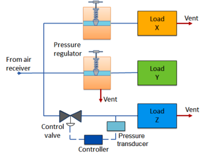 - The third type of regulator has a very large load Z. Therefore its requirement of air volume is very high and can’t be fulfilled by using a simple regulator. In such cases, a control loop comprising of pressure transducer, controller and vent valve is used. Due to large load the system pressure may rise above its critical value. It is detected by a transducer. Then the signal will be processed by the controller which will direct the valve to be opened to vent out the air. This technique can be also be used when it is difficult to mount the pressure regulating valve close to the point where pressure regulation is needed.