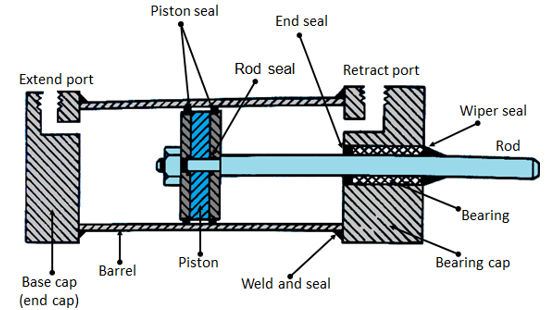 The main parts of a hydraulic double acting cylinder are: piston, piston rod, cylinder tube, and end caps. These are shown in Figure 6.4.2. The piston rod is connected to piston head and the other end extends out of the cylinder. The piston divides the cylinder into two chambers namely the rod end side and piston end side. The seals prevent the leakage of oil between these two chambers. The cylindrical tube is fitted with end caps. The pressurized oil, air enters the cylinder chamber through the ports provided. In the rod end cover plate, a wiper seal is provided to prevent the leakage of oil and entry of the contaminants into the cylinder. The combination of wiper seal, bearing and sealing ring is called as cartridge assembly. The end caps may be attached to the tube by threaded connection, welded connection or tie rod connection. The piston seal prevents metal to metal contact and wear of piston head and the tube. These seals are replaceable. End cushioning is also provided to prevent the impact with end caps.