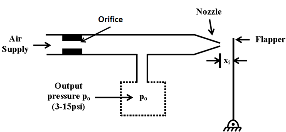 Constant air pressure is supplied to one end of the pipeline. There is an orifice at this end. At the other end of the pipe, there is a nozzle and a flapper. The gap between the nozzle and the flapper is set by the input signal. As the flapper moves closer to the nozzle, there will be less airflow through the nozzle and the air pressure inside the pipe will increase. On the other hand, if the flapper moves further away from the nozzle, the air pressure decreases. At the extreme, if the nozzle is open (flapper is far off), the output pressure will be equal to the atmospheric pressure. If the nozzle is blocked, the output pressure will be equal to the supply pressure.