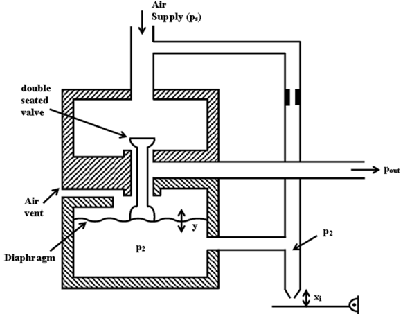 The major limitation of a flapper nozzle amplifier is its limited air handling capacity. The variation of air pressure obtained cannot be used for any useful application, unless the air handling capacity is increased. It is used after the flapper nozzle amplifier to enhance the volume of air to be handled. The principle of operation of an air relay can be explained using the schematic diagram shown in Figure 6.5.3. It can be seen that the air relay is directly connected to the supply line (no orifice in between). The output pressure of the flapper nozzle amplifier (p2) is connected to the lower chamber of the air relay with a diaphragm on its top. The variation of the pressure p2 causes the movement (y) of the diaphragm. There is a double-seated valve fixed on the top of the diaphragm. When the nozzle pressure p2 increases due to decrees in xi, the diaphragm moves up, blocking the air vent line and forming a nozzle between the output pressure line and the supply air pressure line. More air goes to the output line and the air pressure increases. When p2 decreases, the diaphragm moves downwards, thus blocking the air supply line and connecting the output port to the vent. The air pressure will decrease.