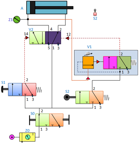 A plastic component is to be embossed by using a die which is powered by a double acting cylinder. The return of the die is to be effected when the cylinder rod has fully extended to the embossing position and the preset pressure is reached. A roller lever valve is to be used to confirm full extension. The signal for retracting must only be generated when the piston rod has reached the embossing position. The pressure in the piston chamber is indicated by a pressure gauge.