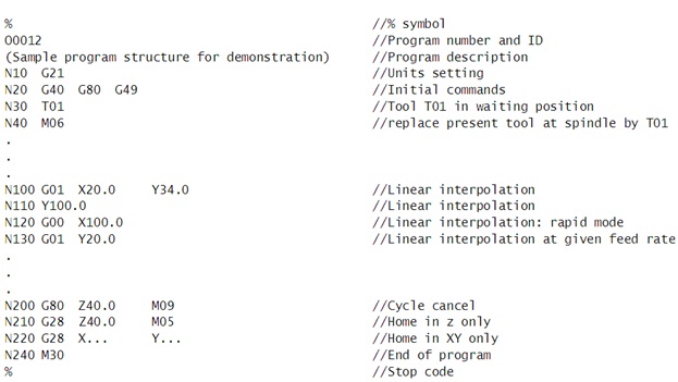 Figure 7.1.7 shows a sample CNC program. It has basically three sections viz. initial commands section; main section and end commands section. In the initial commands section, the program number, its ID, initial safety preparatory codes such as ‘cancel all the activated cycles by previous program’ are to be specified.