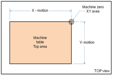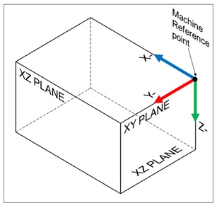 It is also called as home position or machine reference point. It is the origin of a machine coordinate system. On all CNC machines, machine zero is located at the positive end of each axis travel range. Figure 7.2.2 shows the machining volume and various planes. The machine reference point is located at the end of positive ranges of X, Y and Z axes. Figure 7.2.3 and 7.2.4 provide the clear views of the machine reference point. Machine control unit (MCU) understands the dimensions provided with respect to the machine reference point. But the programmer is providing the dimensions on the drawings based on the local coordinate system i.e. part coordinate system.