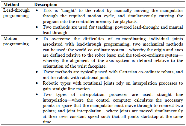 For industrial robots with digital computers as controllers, three programming methods can be distinguished. These are lead-through programming; computer-like robot programming languages; and off-line programming. Lead-through methodologies, and associated programming methods, are outlined in Table 7.6.6.