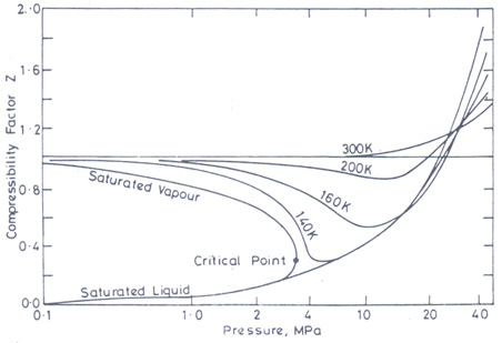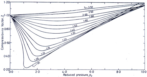 When Z is plotted as a function of reduced pressure and , a single plot, known as general compressibility chart (Figure 10.2) is found to be satisfactory for a wide variety of substances. Although necessarily approximate, the plots are extremely useful in situations where detailed data on a particular gas are lacking but its critical properties are available.