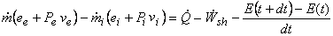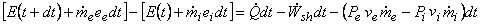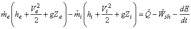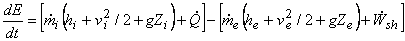 Energy flow as heat into the control volume and the shaft work delivered by the control volume are taken as positive. By applying the first law of thermodynamics, we get