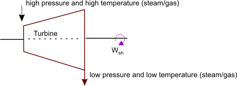 The change in kinetic and potential energy of steam or gas as it passes through the turbine can be ignored without introducing much error. Further, if the heat losses from the turbine are negligible, the first law for this steady state flow reduces to