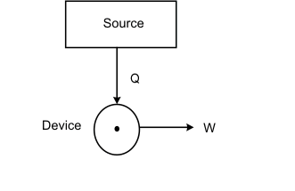 A PMMSK is a hypothetical device (Figure 17.1) which working cyclically, receives energy as heat from a single thermal reservoir, and delivers as equivalent amount of work. The Kelvin-Planck statement of the second law tells us that it is impossible to constructs a perpetual motion machine of the second kind.