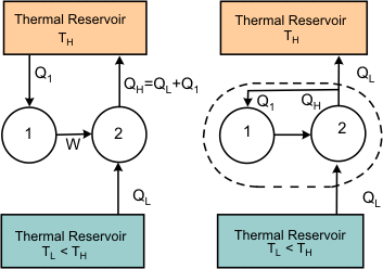 Refer to Figure 17.3 that is, it is possible to construct a device I which, working cyclically, absorbs energy a heat from a source at temperature and performs an equivalent amount of work . Next consider a device II which absorbs amount of energy from a low temperature body at and delivers energy as heat to a high temperature reservoir at . To accomplish this, work is done on the device. The device II does not violate the Clausius statement. For device II, we can write . Now combine I and II. The work delivered by device I is used by device, II.