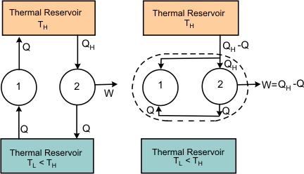This combined device (which is no more aided by any external agency) working cyclically, is not producing any effect other than the transfer of energy as heat from the low temperature reservoir to the high temperature reservoir. This is in violation of the Clausius statement.