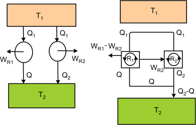 Since is a reversible engine, it can be made to execute the cycle in the reversed order. That is, when work is performed on the device, it absorbs energy as heat, from the reservoir at and rejects energy as heat to the reservoir at . Since, , can be run as a heat pump utilizing part of the work done by . The combination of the two devices is also shown in the figure.