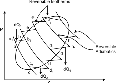 Consider a system undergoing a reversible cycle. The given cycle may be sub-divided by drawing a family of reversible adiabatic lines. Every two adjacent adiabatic lines may be joined by two reversible isotherms (refers to Figure 21.2)