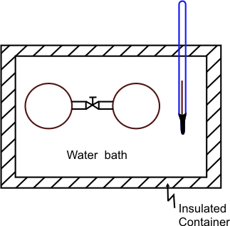 One of the vessels was filled in with air at 22 atm pressure and the other vessel was evacuated. The initial temperature of the water bath was measured. The valve was opened allowing air to occupy both the containers. The temperature of the water bath was measured again and it was found that the temperature did not change. The gas contained in both the vessels is our system. W=0 and Q=0. Since the number of moles of the gas also remains constant, it follows that . The pressure and the volume of the gas changed and yet the internal energy did not change. Hence