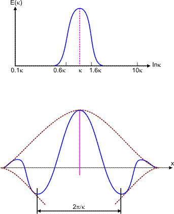For this purpose, we need a more robust picture of an eddy. In Lecture-22 we indicated that an autocorrelation and the corresponding spectrum are a Fourier-transform pair. This suggests that if the correlation is a function of spatial separation, the spectrum is a function of wave number. Thus a certain eddy of size l can be associated with a certain wave number, . An “eddy” of wave number may be thought of as some disturbance containing energy in the neighbourhood of κ. However this disturbance needs to be a fairly broad spike, wide enough to avoid oscillatory behaviour in the correlation.