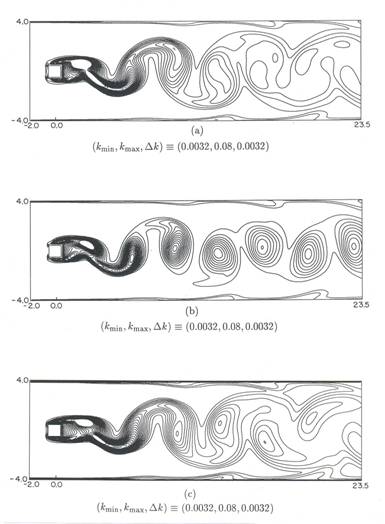 Figure 31.2: Instantenous turbulent kinetic energy contours (a) standard k - ε (b) Kato-Launder k - ε and (c) RNG k - ε .