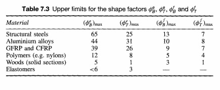 The following table shows the Limits in Shape Efficiency corresponding to different materials