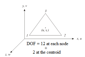 The plate elements with lower degree of polynomial displacement functions cannot simulate true curvature distribution precisely unless a very fine mesh is generated. Bending moment or shear stresses generated by such polynomials are discontinuous as inter element continuity cannot be ensured with a low degree polynomial. Also, many engineering laminates are thin and are analyzed using Classical Laminated Plate Theory (CLPT). By virtue of Kirchhoff hypothesis, the model neglects the effects due to transverse shear and normal strain in the thickness direction. The present finite element formulation is based on CLPT and, thus, limited to thin plates. The element has 3 nodes at the vertices and uses 12 degrees of freedom at each vertex, the in plane displacements in the x and y directions and their first derivatives, along with the normal displacement in the thickness direction and its first and second derivatives. Two more in-plane displacements at the centroid of the element are condensed out before assembly. The displacement functions used here are the same as used in the high precision elements developed by Jeyachandrabose et al [1985] and Bhattacharya et al [1998]. These high precision elements are recognized for accurate deformation prediction. They have used complete cubic polynomials for the in-plane displacements u, v and a constrained quintic polynomial for the normal displacement w. The elements are completely conforming and rapidly converging. Each element has total 38 degrees of freedom (DOF). The coordinate system and element configuration are shown in Figure 16.1.