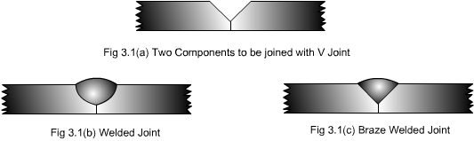 The strength of brazed joint is higher than soldered joint but lower than welded joint. However, in between welding and brazing there is another process termed as ‘braze welding'. Braze Welding: Unlike brazing, in braze welding capillary action plays no role but the filler metal which has liquidus above 450 ° C but below the melting point of parent metal, fills the joint like welding without the melting of edges of parent metal. During the operation, the edges of the parent metal are heated by oxy-acetylene flame or some other suitable heat source to that temperature so that parent metal may not melt but melting temperature of filler metal is reached. When filler rod is brought in contact with heated edges of parent metal, the filler rod starts melting, filling the joint. If edges temperature falls down then again heat source is brought for melting filler rod. The molten filler metal and parent metal edges produce adhesion on cooling resulting into strong braze weld.