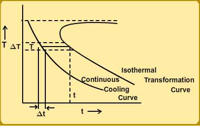 It is possible to go from TTT diagrams to CCT diagrams under certain circumstances, namely, if we assume that the kinetics of the transformation depends only one the fraction of the phases transformed and the temperature. In Figure 7 we show how to calculate the CCT diagram from the isothermal transformation curve, schematically; the steps involved are as follows: |