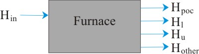 Consider a fuel fired furnace used to heat the charge at the temperature . The furnace attains a steady state temperature at certain ratio of mass of fuel/mass of air. At steady state operation of the furnace, a certain amount of heat Hin is generated at the adiabatic flame temperature by combustion of fuel. Heat is being carried out by the products of combustion (HPOC) at temperature . The heated charge carries heat (Hu) at temperature . Some amount of heat is lost at temperature through the walls of the lining. The inputs and output of heat are shown in the figure