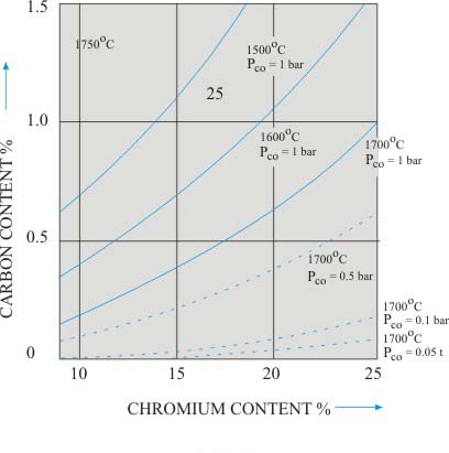 The above observations suggest that high temperature is needed to remove carbon in presence of chromium, if stainless steel is produced at atmospheric pressure. If reduced pressures are used; lower temperature can cause oxidation of carbon.