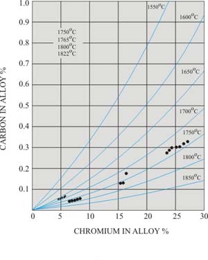 Figure 18.1 shows carbon and chromium contents of simple Fe-Cr-C melt in equilibrium with pure solid Cr2O3 and CO gas at one atmospheric pressure at various temperatures. Carbon in the melt can be preferentially oxidized at much higher temperature without much loss of chromium. This can be done by oxygen lancing to molten bath. Any excess chromium would be oxidized and will have to be recovered from slag.