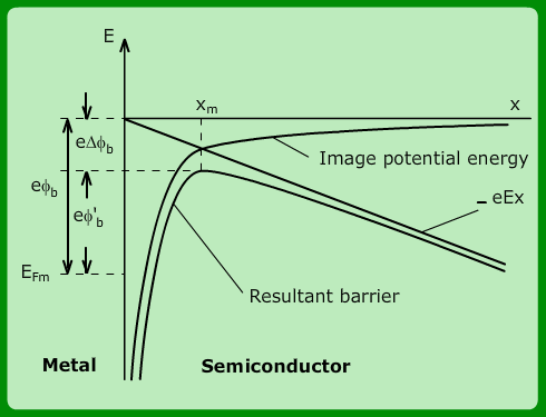 In a Schottky diode, as an electron leaves the metal and enters the semiconductor, it leaves behind a (+)ve image charge and interacts with it via the image force.