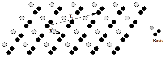 | The lattice is an infinite array of points arranged in space so that each point has identical surroundings. This means, you can go to any lattice point and it will have the same environment as the others. The basis means atoms attached to each lattice point. | |