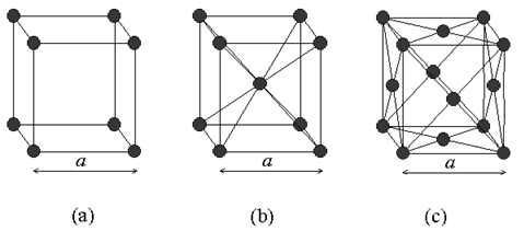 Fig. 2.5 (a) Simple Cubic, (b) body centered cubic (bcc) and (c) Face centered cubic (fcc) crystal |