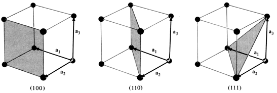 Fig 2.7. Three lattice planes, (100), (110) and (111) plane. |