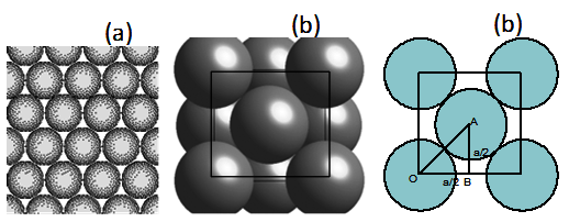 multiplied by volume of a sphere (atom) divided by volume of the unit cell) The closely packed hard spheres are as given in figure2.5. Here the right side a cubic face (b and c) view is given where, you can see the sphere appears in the middle of the face. The lattice constant a is now 2OB (see figure 2.5 c). Considering triangle OAB, the radius of the sphere is just OA/2 that is √2 a/4 . |