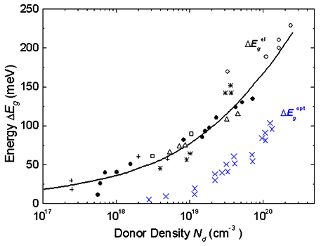 | Another important effect of heavy doping is narrowing of the band gap. This can seriously affect the device performance. For example, in silicon we can approximate the effect of donor densities
