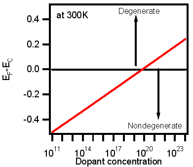If you look at the doping effect on the Fermi level (Fig 2.31), as the dopant concentration increases, at a particular concentration, the Fermi level enters into the conduction band, which changes from non-degenerate to degenerate case . For example, in the case of silicon, the effect is plotted in figure 2.33. Just to mention, heavily doped silicon is often used as a replacement for metals where the resistance is much lower than