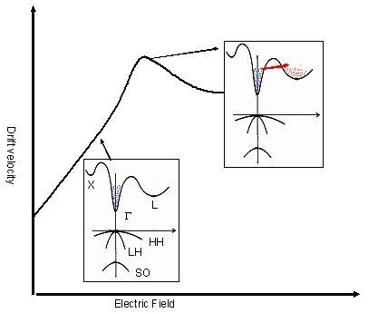 | Whereas in the direct band gap materials it is entirely different, because, they contain multiple closely spaced conduction minima (for example, in GaAs, EΓ=1.42eV; EL=1.71eV; Ex=1.90eV) for electron transport. Typically, the variation in the mobility is due to the inter valley transfer from the zone center valley (EΓ; m*=0.067m0) to L (EL; m*=0.22m0) valley having different effective mass contributions. Below a certain field, electrons are primarily in low effective mass and a high mobility valley that is Γ valley. As the field is increased, the electrons get transferred from the totally filled Γ valley to slightly higher L valley, where the difference between these two valleys is ~0.3eV. This is called Inter-valley transfer (see fig.2.42). Schematic representation of inter-valley transfer is given in the figure. Since upper valley electrons are heavy, the electron velocity decreases even though the field is increasing. This type of field behavior is desirable for some specific devices such as high-frequency microwave devices. For instance, low mass and high inter-valley separation is needed to have superior velocity-field behavior, for instance a material In0.53Ga0.47As (m*=0.04m0 and Γ-L separation= 0.55eV) shows higher peak velocity than conventional GaAs. | |