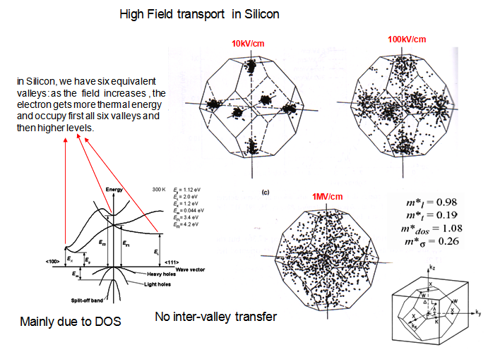 | Fig 2.44 Schematic representation of high-field effects in indirect bandgap semiconductors, example for Silicon is giving here. Unlike direct band gap Silicon is having six-equivalent energy valleys (2 π/a)(0.85,0,0); (2 π/a)(0,0.85,0), (2 π/a)(0,0,0.85); And inverse of these three). Therefore as the field increases , the electron gets more thermal energy and occupy first all six valleys simultaneously and then higher levels. The schematic representation of valley filling at Electric fields is schematically shown. We can call this transport as “intra-valley” transfer. | |