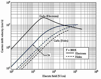 drift velocity of carriers ( electrons and holes) with electric field for a direct (GaAs) and an indirect (Si) band gap