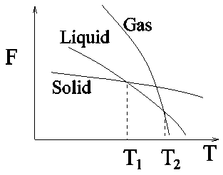 Figure 2.1: Variation of Helmholtz free energy F against temperature T at a constant pressure for a system in solid, liquid and gaseous phases. After T1, the system spontaneosly goes to the liquid phase.