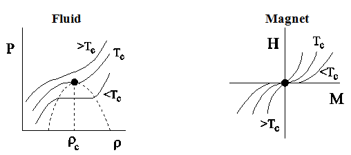 Figure 2.5: Schematic plot of pressure P versus density ρ isotherms for a fluid system and of H versus M for a magnetic system. |