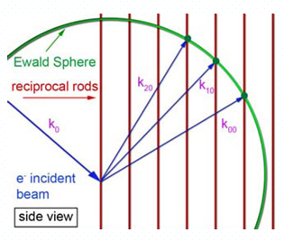 • The side view is shown in the figure 8.02. In reciprocal space, the two-dimensional array of the surface atoms turns into vertical lines, i.e., the reciprocal rods. The condition for constructive interference of the elastically scattered electron beams from the surface is fulfilled whenever these rods cross the Ewald sphere, as shown in figure.