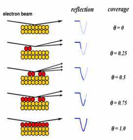 Figure 8.04: Schematic of surface coverage and corresponding reflctions in RHEED.