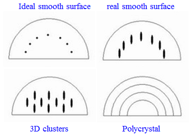 • RHEED patterns change to different nature for typical 3D clusters and exhibit a continuous line profile for a polycrystal.