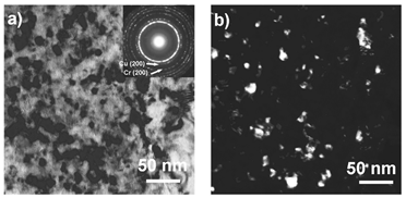 Figure 14.04 (a) displays the TEM bright-field image and related SAED pattern of the CuCr43 composite in nanometer range. The dark field image on the Figure 14.04 (b) was obtained by selecting a part of the first ring with a small aperture. This image clearly shows the grain size is in a range of only 10 to 20 nm.