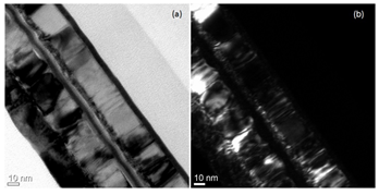 Figure 14.05: (a) TEM bright-field and (b) dark-field couple images of cross-section view of a magnetic tunneling junction shows the contrast from layer by layer [4].