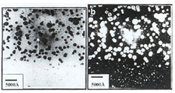 Figure 14.06: (a) Ni-Cu-2-Methoxyethanol colloid electron micrograph at 20 K magnification; 78.4% Ni and 21.6% Cu (a) Bright-field (b) Dark-field [5].