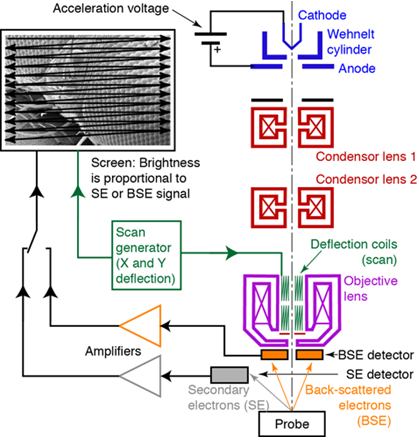 • Figure 17.01 shows the schematic representation of the SEM. The principle elements are electron gun, condenser lens, scanning or deflection coils.