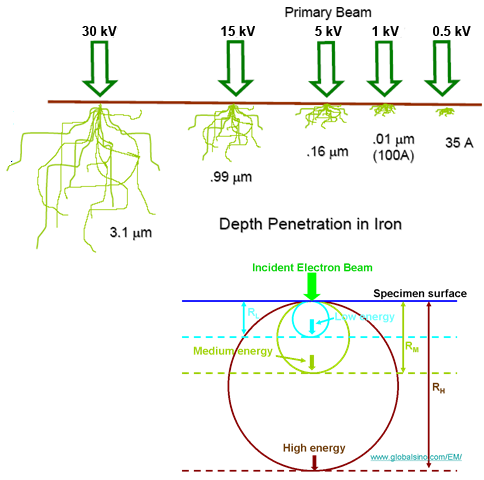 Figure 17.04 shows the schematic of penetration depth and volume at different beam energies.
