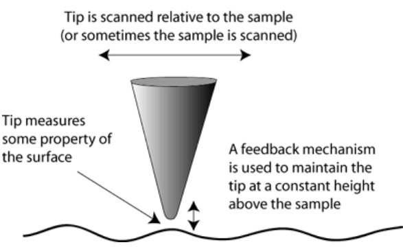 1. Uses a sharp probe (or tip), instead of laser beam or electrons as demonstrated in Figure 20.01. Hence, no restriction of wavelength.