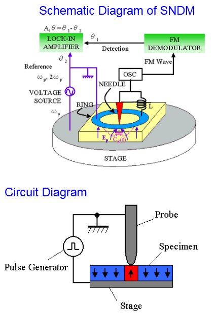 • Scanning nonlinear dielectric microscope is a purely electrical method which can map the polarity of ferroelectric domains by detecting the capacitance from the frequency variation of a LC resonator.
