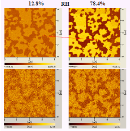 SNDM images of multi-domain structures of a congruent LiTaO3 single crystal thin plate (CLT) at RH 12% and 78%. From the image, water layer increases sensitivity, whereas decreases lateral resolution. This shows that the image reproducibility is depended on RH in the vacuum chamber [7,8].